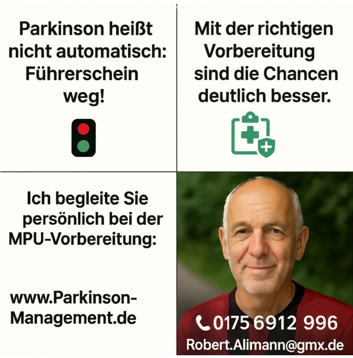 Für viele Menschen mit Parkinson ist der Führerschein ein Stück Selbstständigkeit. Gleichzeitig kann die Erkrankung Fragen zur Fahrtauglichkeit aufwerfen. Wenn die Behörde eine medizinisch-psychologische Untersuchung (MPU) anordnet, zählt gute Vorbereitung – medizinisch, psychologisch und mental. Mit einem strukturierten, parkinson-spezifischen Programm steigen Ihre Chancen auf ein positives Ergebnis deutlich.